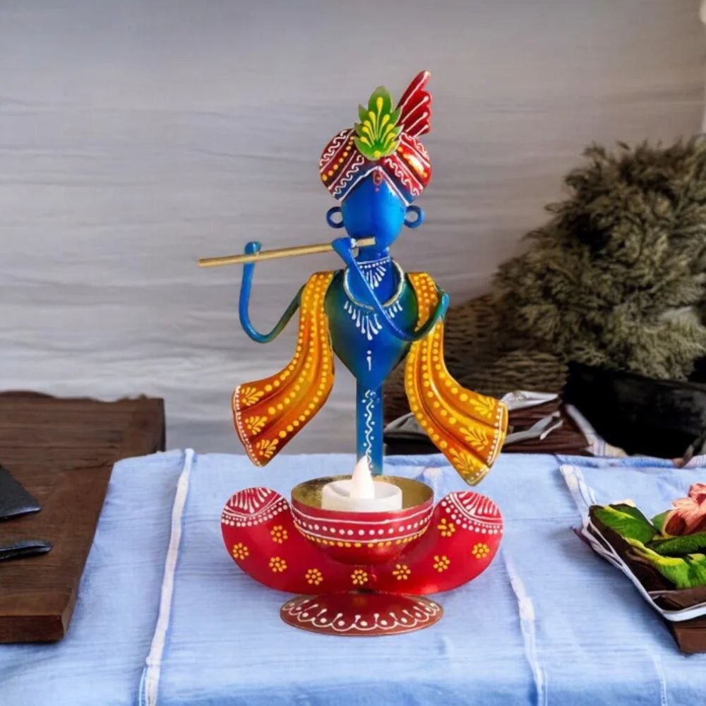 The Blue Metal Krishna Showpiece Tea Light Holder is a beautifully crafted decorative piece that combines spirituality with elegant functionality. Made from durable metal and finished in a soothing blue hue, this showpiece features a detailed depiction of Lord Krishna, symbolizing peace, love, and divine grace. Designed to hold a tea light candle, it creates a warm, calming glow that enhances the spiritual ambiance of any space.