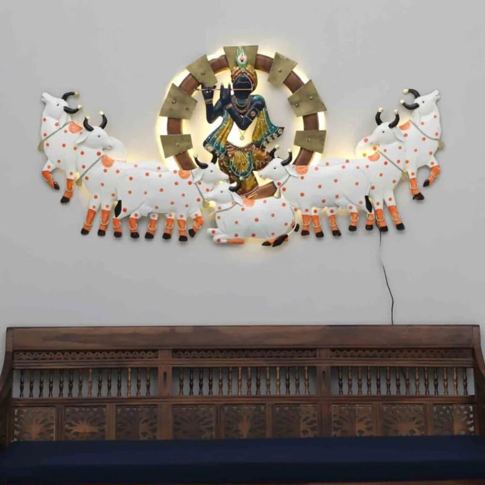 The warm LED backlighting subtly illuminates Krishna Ji’s figure, highlighting the flute in his hand and the gentle expression on the cow, creating a captivating visual effect that draws immediate attention. Finished in a sophisticated metallic tone with hints of color, this piece blends seamlessly with both traditional and modern décor styles.